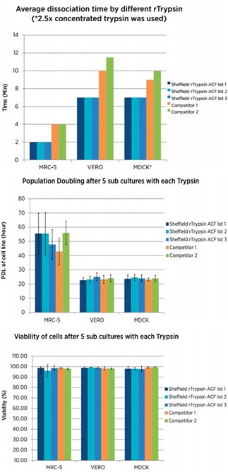 - 從產(chǎn)品性能方面,其適用的細胞類型廣泛(如Vero、HEK、MRC-5等),消化效率高且更加溫和,不傷細胞,主要表現(xiàn)為消化傳代后的細胞倍增時間更短,細胞活率更高。