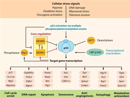 通常情況下,p53蛋白在正常細(xì)胞中壽命很短,表達(dá)水平也低。但在經(jīng)歷了基因損傷或致癌基因激活時(shí),許多腫瘤細(xì)胞表達(dá)高水平的突變p53蛋白,在眾多調(diào)控通路中,磷酸化對(duì)p53蛋白活性的調(diào)節(jié)起關(guān)鍵作用,目前最廣泛被接受的觀點(diǎn)是:當(dāng)DNA損傷溫和且短暫時(shí),p53主要發(fā)揮促進(jìn)生存(pro-survival)功能,比如促進(jìn)細(xì)胞周期停滯,促進(jìn)DNA修復(fù),降低活性氧,提高能量供應(yīng)等。當(dāng)DNA損傷難以修復(fù)時(shí),p53則會(huì)促進(jìn)死亡(pro-death)的模式,比如誘導(dǎo)細(xì)胞衰老,凋亡或者鐵死亡等。
