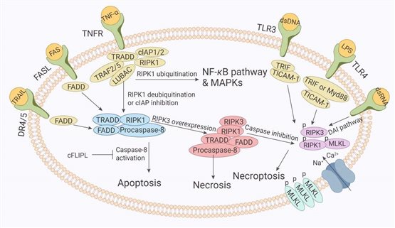 Fas又稱CD95,是由325個氨基酸組成的受體分子,它與其配體FASLG(CD178)結(jié)合可以啟動凋亡信號的轉(zhuǎn)導引起細胞凋亡。Fas具有特殊的死亡結(jié)構域(DD,death domain),三聚化的Fas和FASLG結(jié)合后,使三個DD相聚成簇,吸引了胞漿中另一種帶有相同死亡結(jié)構域的蛋白FADD。FADD是死亡信號轉(zhuǎn)錄中的一個連接蛋白,它由兩部分組成:C端(DD結(jié)構域)和N端(DED)部分。C端與Fas的DD結(jié)構域結(jié)合,N端連接另一個帶有DED的后續(xù)成分,由此引起N端DED隨即與無活性的caspase-8發(fā)生反應,進而引起caspases級聯(lián)反應,誘發(fā)細胞凋亡。Fas/FASLG涉及許多癌癥和免疫疾病的發(fā)病機制,如多發(fā)性硬化癥[2]。