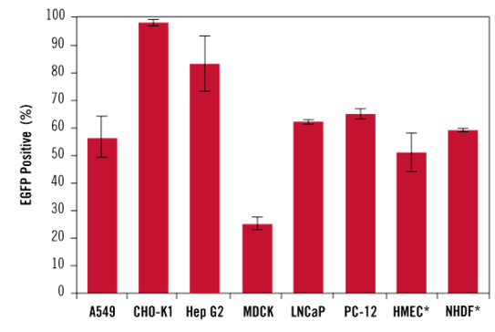 用TransIT-X2®將EGFP質(zhì)粒轉(zhuǎn)染到多種細(xì)胞系和原代細(xì)胞中都實(shí)現(xiàn)了高效表達(dá)