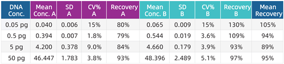 準(zhǔn)確性與可重復(fù)性測(cè)試。由兩名操作員(A和B)分別在兩天內(nèi)對(duì)已知DNA樣本進(jìn)行兩次檢測(cè),計(jì)算檢測(cè)結(jié)果的SD, CV和回收率%(見(jiàn)下表)。