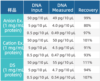過(guò)程樣品與藥物原液(DS)檢測(cè)結(jié)果對(duì)比。對(duì)比含有1 mg/mL陰離子交換或陽(yáng)離子交換純化的蛋白樣品或藥物蛋白的CHO DNA回收率(見(jiàn)下表)。
