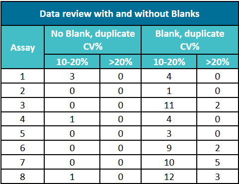 表2. 經(jīng)過空白對照校正后的CV%與未校正數(shù)據(jù)的CV%值對比