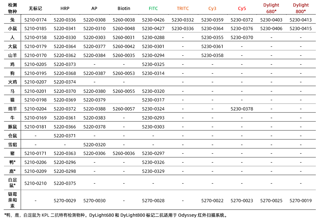 - 種屬齊全:KPL 的二抗覆蓋20 多個物種,主要種屬有:人、兔、小鼠、大鼠、山羊、綿羊、馬、牛、猴、豬、貓、雞、豚鼠、倉鼠等,其中特殊物種二抗有鴨、鹿和白足鼠。